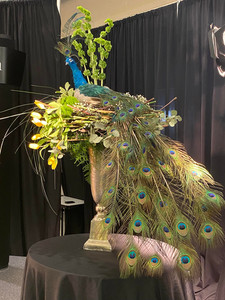 Hargrove, a Georgia resident and long-time member of AIFD, dazzled the crowd with a variety of work for different events, some of which later adorned the gala cocktail area. The stage was crowded with large and small themed groupings fit for garden parties to Mardi Gras. His designs celebrated gardens, enthroned peacocks and cascaded with colorful umbrellas and were a popular setting for photos while featured in the hotel Saturday evening.